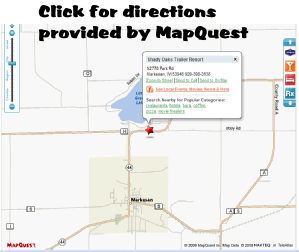 Home About Us Events Sale Links Mail: ShadyOak@dotnet.com About Lake Pictures Pictures Enjoy Nature Shady Oaks is located in the grand community of Markesan, WI.  Just... 1 hour from Madison 1½ hours from Milwaukee 3 hours from Chicago For all you Geocachers:  We’re located at: N43° 43.792 W88° 58.902 Time to enjoy another great season! Website Developed by: C.M.Ross Mail: puggingfiggy@gmail.com Welcome to (920) 398 - 3138 Shady Oaks Campground N2770 Park Rd. Markesan, WI 53946 (920) 398-3138 Call for questions or reservations: