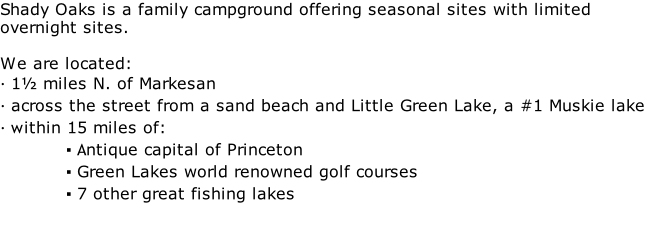 Home About Us Events Sale Links Mail: ShadyOak@dotnet.com About Lake Pictures Pictures About Us Enjoy the beach area right outside of the Park.  The well maintained beach is the pride and joy of the Markesan Lions Club. Tired of hauling your trailer, Seasonal sites with sewer are available.  Just call (920) 398-3138.  Enjoy the beautiful, easy going life style of Markesan every weekend. Picnic Table and fire ring at each site Wood Available Hot Showers Flush Toilets Full hook-ups with Sewer available Website Developed by: C.M.Ross Mail: puggingfiggy@gmail.com Welcome to (920) 398 - 3138 WiFi  Available Shady Oaks Campground N2770 Park Rd. Markesan, WI 53946 (920) 398-3138 Call for questions or reservations: Germantown Sno Drifters Pool Party 2012