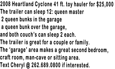 Home About Us Events Sale Links Mail: ShadyOak@dotnet.com About Lake Pictures Pictures Trailers are sold by owner.  For rate information or general questions please call (920) 398-3138 Trailers for Sale All sites have sewer! Welcome to (920) 398 - 3138 Shady Oaks Campground N2770 Park Rd. Markesan, WI 53946 (920) 398-3138 Call for questions or reservations: 24’ Bullet Asking 20,000 Call 920-921-9103 for Info 2019 40’ Salem Hemisphere Model 370BL Composite Deck Asking 55,000 Call 262-385-6592 For Info